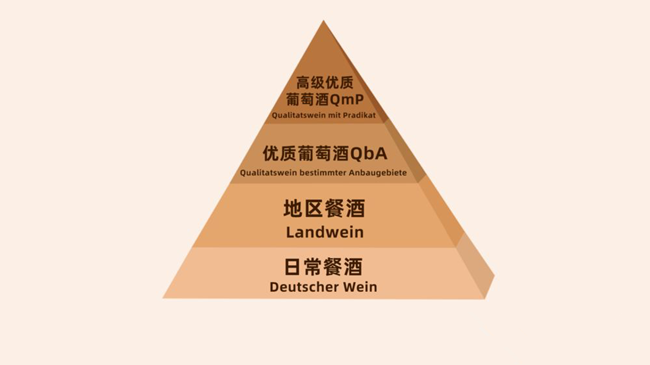 德國作為歐盟成員國之一,出產(chǎn)的葡萄酒也遵循這一法規(guī)。德國的葡萄酒從低至高主要分為四個(gè)等級(jí):日常餐酒(Deutscher Wein)、地區(qū)餐酒(Landwein)、優(yōu)質(zhì)葡萄酒(Qualitatswein bestimmter Anbaugebiete,簡稱QbA)和高級(jí)優(yōu)質(zhì)葡萄酒(Qualitatswein mit Pradikat,簡稱QmP)。
