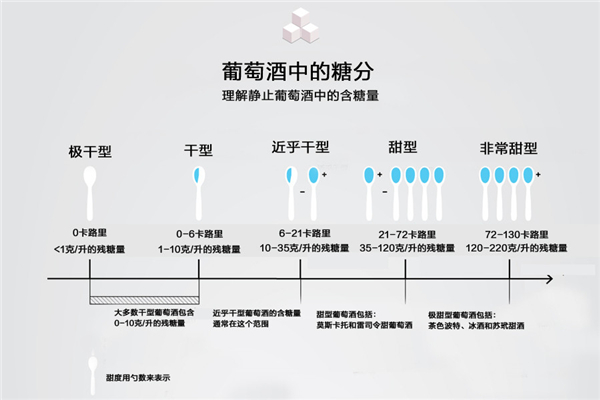 國際上還有一種通用的量化方法,那就是用勺數(shù)來表示,詳見下圖。一個標(biāo)準(zhǔn)勺為 1 盎司(約等于 28.35 克),如下圖所示,干型的殘?zhí)橇糠秶恍蜗蟮谋硎緸?0 勺到 1/3 勺之間,近乎干殘?zhí)橇康姆秶槐硎緸?1/3 勺至1勺+之間。