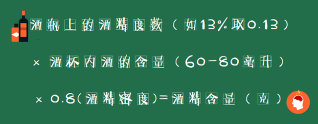 大家常飲用的葡萄酒度數一般為11 - 13%,按照不超過酒杯1/3的倒酒標準,一杯葡萄酒通常有60 - 80毫升。按下圖計算公式,喝一杯葡萄酒,你將攝入5 - 8克酒精。
