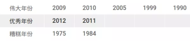 建議:如果想要一瓶馬上可以喝的品質(zhì)優(yōu)異的勃艮第的話(huà),2009年份是很好的選擇。這一年的勃艮第普遍酸度較低,單寧成熟度較高,適合較早飲用。2010年份的夜丘也不錯(cuò),不過(guò)該年份產(chǎn)量較低,不太容易買(mǎi)到合理價(jià)位的酒。2011年份則表現(xiàn)不均勻。對(duì)于收藏家來(lái)說(shuō),2005年份仍然是首選,前提是你現(xiàn)在還能買(mǎi)得到!