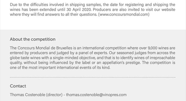 針對目前流行的Covid-19新型冠狀病毒對于全球的影響,在經(jīng)過組委會(huì)與主辦地的積極協(xié)商后,現(xiàn)決定“2020(捷克·布爾諾)比利時(shí)布魯塞爾國際葡萄酒大獎(jiǎng)賽”將延期至2020年6月26日至28日舉辦。同時(shí),為了緩解報(bào)名企業(yè)的物流運(yùn)輸壓力,全球樣品征集截止時(shí)間也將適度順延。
