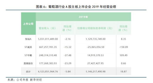 2019年四家葡萄酒企實(shí)現(xiàn)總營收61.24億元,同比降低5.84%;實(shí)現(xiàn)歸屬于母公司凈利潤11.46億元,同比增加18.87%。其中,張?jiān)I收達(dá)50.31億元,雖然稍低于年初制定的力爭實(shí)現(xiàn)營業(yè)收入不低于53億元的目標(biāo),但其龍頭地位毋庸置疑,經(jīng)營業(yè)績遙遙領(lǐng)先。并且,張?jiān)?019年?duì)I收占全國葡萄酒行業(yè)規(guī)模以上企業(yè)銷售收入的34.68%;2019年實(shí)現(xiàn)歸母凈利11.30億元,超過了全國葡萄酒行業(yè)規(guī)模以上企業(yè)利潤總額(10.58億元)。