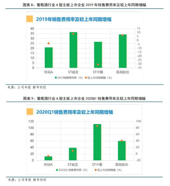銷售費(fèi)用率水平一定程度上反應(yīng)了酒企在品牌和渠道建設(shè)上做出的努力。2019年四家葡萄酒企銷售費(fèi)用率高于20%,行業(yè)整體處于高位水平,這也在一定程度上反應(yīng)出葡萄酒市場競爭更加激烈。其中,ST威龍表現(xiàn)最突出,2019年銷售費(fèi)用率達(dá)36.4%,較上年同期增幅8.45%,其年報(bào)解釋稱主要是報(bào)告期內(nèi)促銷費(fèi)增加所致。