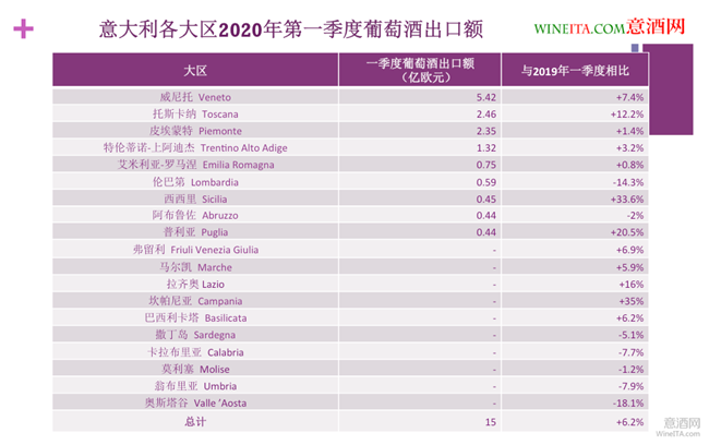 意大利南部各大區(qū)葡萄酒的出口額在2020年一季度普遍出現(xiàn)增長。西西里大區(qū)(Sicilia)葡萄酒2020年第一季度出口額為0.45億歐元,同比去年增長33.6%;普利亞大區(qū)(Puglia)一季度出口額為0.44億歐元,同比去年增長20.5%。