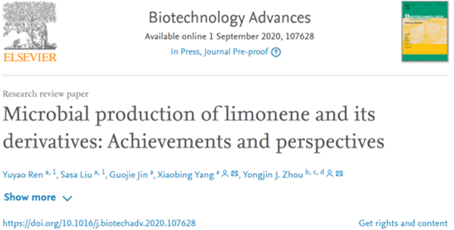 近日,葡萄酒學院楊曉兵副教授團隊在著名生物技術學術期刊《Biotechnology Advances》(IF=10.744)發表了題為 “Microbial production of limonene and its derivatives: Achievements and perspectives” 的綜述文章,系統總結了近年來利用代謝工程和合成生物學策略合成檸檬烯及其衍生物研究進展。西北農林科技大學為第一署名單位,中科院大連化學物理研究所為合作單位;16級本科生任毓瑤和18級博士研究生劉灑灑為共同第一作者,我校楊曉兵副教授與大連化物所周雍進研究員為共同通訊作者,我校靳國杰副教授參與了該綜述的撰寫工作。《Biotechnology Advances》是生物技術領域頂級國際期刊,在105種應用微生物與生物技術相關的雜志中排名第3,該雜志全年收錄文章在100篇左右,2019年H指數161。