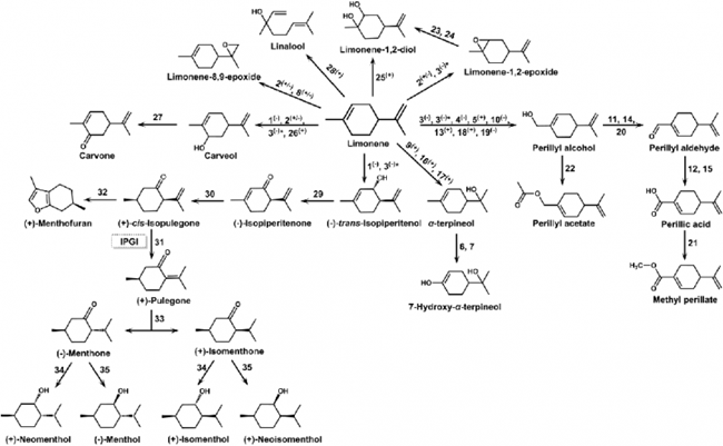 葡萄與葡萄酒中單萜類化合物能夠賦予葡萄與葡萄酒濃郁獨特的芳香,如玫瑰、桂花、鳳梨及蜂蜜等香味。檸檬烯是葡萄與葡萄酒中天然存在的具有代表性的單帖香氣物質之一,在微生物作用下能夠衍生出數十種單萜類化合物。闡釋檸檬烯生物合成途徑及衍生化過程有助于理解葡萄與葡萄酒萜烯類香氣物質的形成機制,為利用代謝工程進行葡萄育種研究,以及采用工程菌調控葡萄酒品種香氣物質組成開展前瞻性研究提供理論依據。此外,利用合成生物學和代謝工程策略構建高效檸檬烯及其衍生物微生物細胞工廠能夠為葡萄園廢棄物高值化再利用,實現葡萄酒產業提質增效提供新思路。