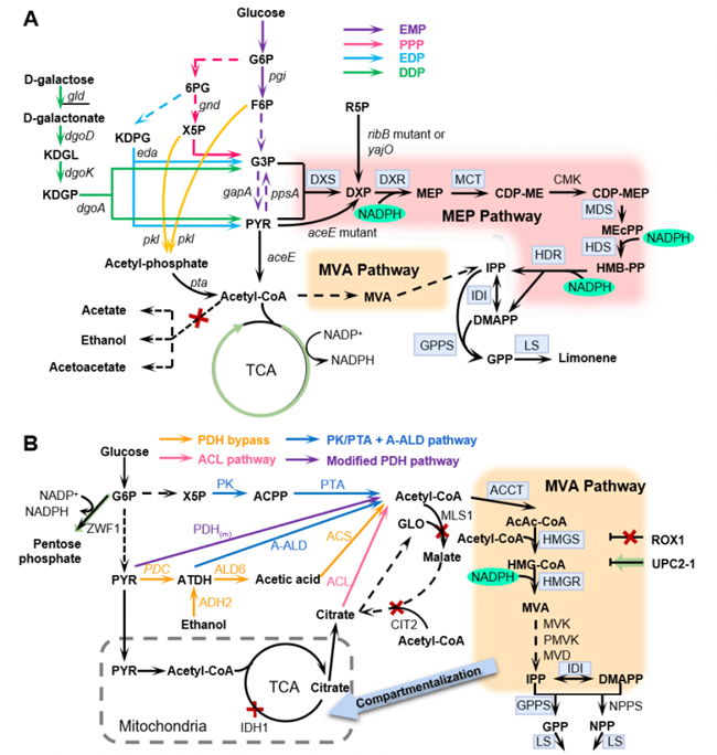 楊曉兵副教授團隊長期致力于利用代謝工程和合成生物學策略構建高價值化合物細胞工廠的研究工作。目前,已利用代謝工程策略成功改造圓紅冬孢酵母(Rhodosporidium toruloides)構建了檸檬烯等單帖化合物、羥基化脂肪酸、氨基酸衍生物的細胞工廠,其中檸檬烯微生物合成相關研究工作獲得陜西省面上基金(2020JM177)、學校科研啟動基金、國家級科創等支持,指導2016本科生任毓瑤畢業論文獲得校級畢業論文。該綜述介紹了微生物合成檸檬烯及其衍生物面臨的機遇與挑戰,詳細闡述了異戊二烯途徑多樣性、代謝路徑關鍵酶的發掘與表征、宿主細胞代謝路徑的理性調控、輔因子平衡、檸檬烯及其衍生物生物毒性的解除及提升宿主微生物魯棒性的策略等內容。本綜述詳盡討論了大腸桿菌、釀酒酵母、藍細菌和產油酵母等生產平臺菌株的優勢與不足,為系統地理性改造微生物代謝網絡構建單帖細胞工廠提供了科學參考。