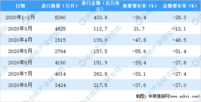2020年1-8月中國(guó)葡萄酒進(jìn)口量及金額增長(zhǎng)情況