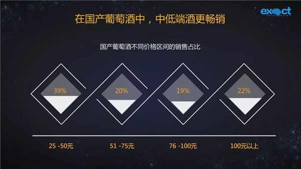 從消費市場來看,國產葡萄酒銷量占比最大的價格區間集中在25-50元,其次是51-75元、76-100元。單價100元以內的占據國產葡萄酒市場近八成。