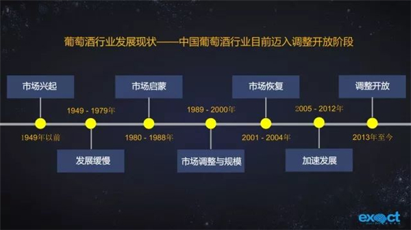 從產業發展的角度看,中國葡萄酒產業發展主要經歷了7個階段,目前可以看出已邁入調整開放階段。