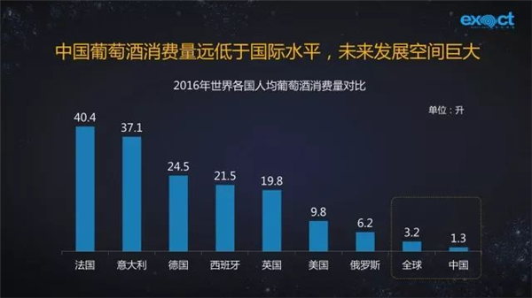 2016年,中國人均葡萄酒消費量僅為1.3升,與法國、意大利、德國有很大差距,也低于全球平均水平。中國葡萄酒消費還有很大的發展空間。