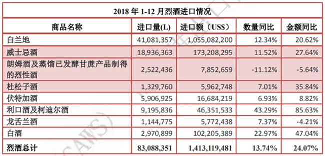 2018 年,烈酒進(jìn)口保持上行趨勢(shì),且量額均實(shí)現(xiàn)了兩位數(shù)增長(zhǎng),進(jìn)口總額達(dá)到 14.1 億美元,約占酒類(lèi)進(jìn)口總額的 24.5%,位列進(jìn)口酒類(lèi)第二位。其中: