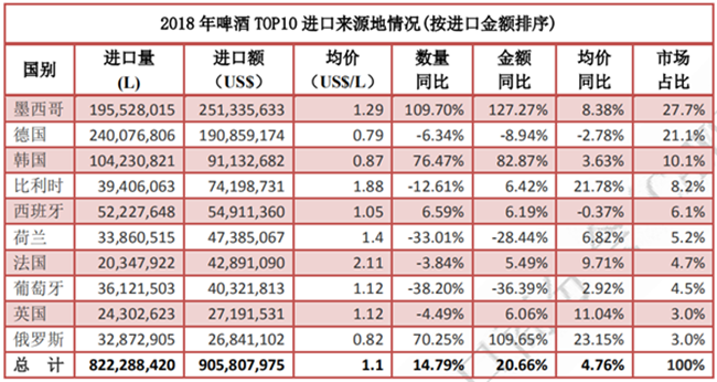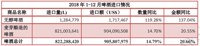 2018 年,啤酒進(jìn)口增長(zhǎng)提速,進(jìn)口量 8.2 億升,同比增長(zhǎng) 14.8%,進(jìn)口額 9.1 億美元,同比增長(zhǎng) 20.1%,約占酒類(lèi)進(jìn)口總額的 15.7%,位列進(jìn)口酒類(lèi)第三位。