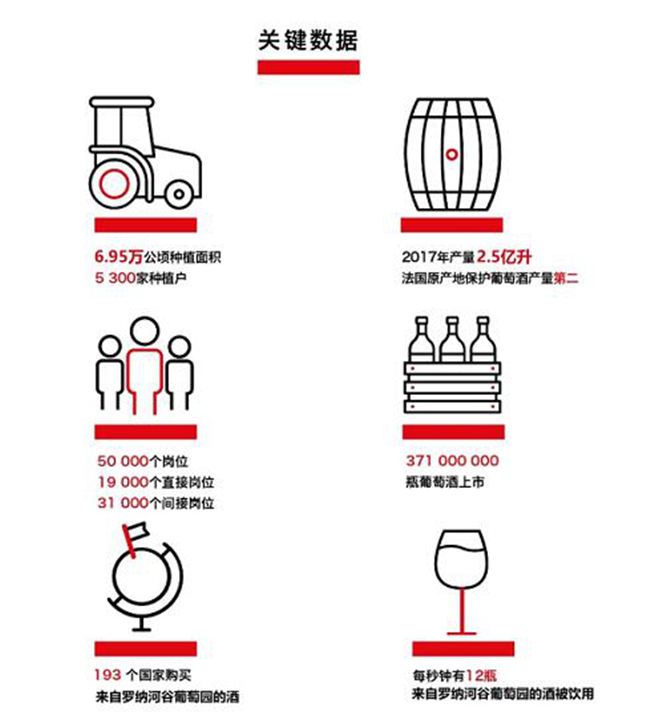 羅納河谷葡萄酒產(chǎn)區(qū)擁有6.95萬(wàn)公頃種植面積,5300家種植戶。2017年份葡萄酒總產(chǎn)量達(dá)2.5億升,產(chǎn)量在法國(guó)AOC產(chǎn)區(qū)中排名第二,羅納河谷葡萄園的酒出口到193個(gè)國(guó)家,每秒鐘有12瓶來(lái)自羅納河谷葡萄園的酒被飲用。