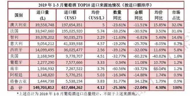 近日,中國(guó)食品土畜進(jìn)出口商會(huì)酒類進(jìn)出口商分會(huì)發(fā)布2019年一季度酒類進(jìn)口統(tǒng)計(jì)報(bào)告。報(bào)告顯示,一季度,進(jìn)口酒類市場(chǎng)整體呈下行態(tài)勢(shì),且降幅仍在擴(kuò)大。其中,葡萄酒進(jìn)口延續(xù)跌勢(shì),量額跌幅均逾兩成。進(jìn)口量1.5億升,進(jìn)口額6.2億美元,約占酒類進(jìn)口總額的55.4%。