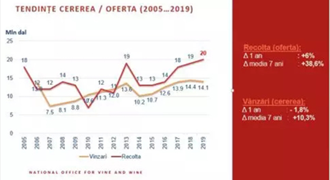 在2018-2019葡萄酒年,基于過去兩年創(chuàng)紀(jì)錄的大收成,葡萄酒供需比基本上達(dá)到了自2013年實施禁運(yùn)后的數(shù)值。過去7年的平均數(shù)據(jù)顯示,鑒于摩爾多瓦共和國85%的葡萄酒銷往國外,產(chǎn)自摩爾多瓦的葡萄酒是出口市場所能消化的4倍。
