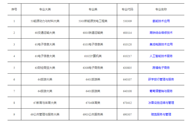 根據(jù)《普通高等學(xué)校高等職業(yè)教育(專科)專業(yè)設(shè)置管理辦法》,在相關(guān)學(xué)校和行業(yè)提交增補專業(yè)建議的基礎(chǔ)上,教育部組織研究確定了2019年度增補專業(yè)共9個,現(xiàn)予公布,自2020年起執(zhí)行。