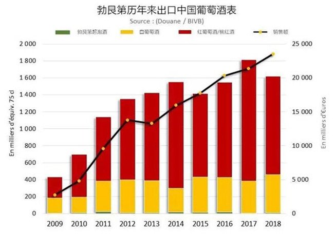 2018年勃艮第出口了1600萬瓶葡萄酒到中國大陸,這個(gè)數(shù)量比2017年同期降低了10.6%,但出口價(jià)值達(dá)到了2350萬歐元,比2017年同期上漲了9.9%。