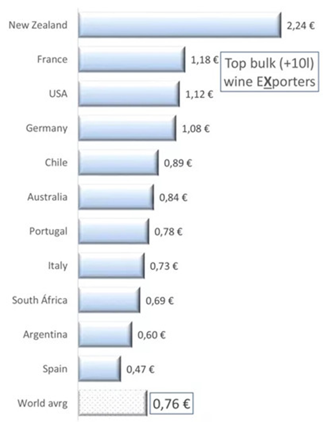 在頂級散裝酒出口國中:新西蘭的散裝葡萄酒出口價格最高,每升超過2歐元。排名第二的是法國,每升價格為1.18歐元;排名第三的是美國,每升價格為1.12歐元;排名第四的是德國,每升價格為1.08歐元;