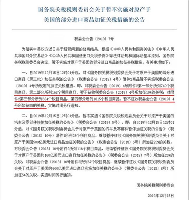 作為回應(yīng),中國(guó)將購(gòu)買更多的美國(guó)農(nóng)產(chǎn)品,增加美國(guó)公司進(jìn)入中國(guó)市場(chǎng)的機(jī)會(huì)。因此,中國(guó)國(guó)務(wù)院關(guān)稅稅改委員會(huì)發(fā)布公告,將暫停實(shí)施原計(jì)劃于 2019 年 12 月 15 日 12 時(shí) 01 分起實(shí)施的《國(guó)務(wù)院關(guān)稅稅則委員會(huì)關(guān)于對(duì)原產(chǎn)于美國(guó)的部分進(jìn)口商品(第 3 批)加征關(guān)稅的公告》加征關(guān)稅措施。具體政策如下: