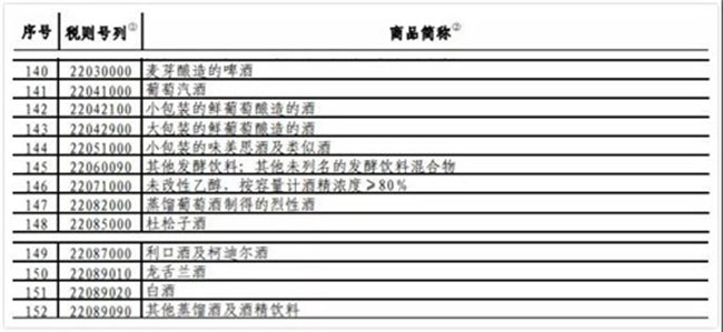 葡萄酒在內(nèi)的酒類商品作為美國(guó)重要的農(nóng)產(chǎn)品,就包含在《國(guó)務(wù)院關(guān)稅稅則委員會(huì)關(guān)于對(duì)原產(chǎn)于美國(guó)的部分進(jìn)口商品(第 3 批)加征關(guān)稅的公告》(稅委會(huì)公告〔2019〕4 號(hào))附件 2 第 1 部分商品內(nèi),因此可以免予在此前基礎(chǔ)上加征的 10% 關(guān)稅。具體包含內(nèi)容如下: