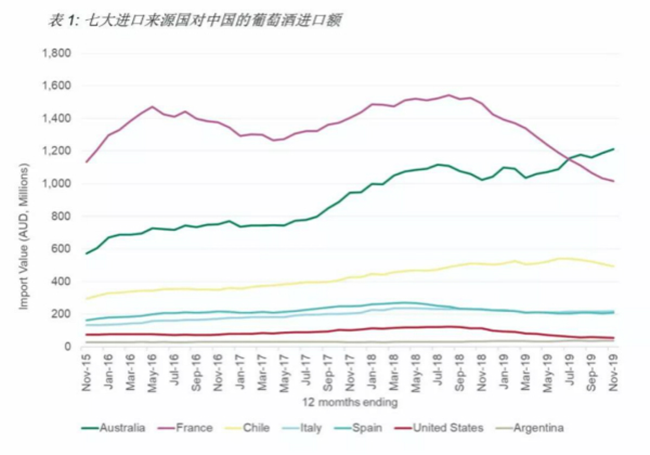 截至2019年12月底的12個月中,澳大利亞葡萄酒對中國市場(包括香港和澳門)的出口額增長12%,創(chuàng)下12.8億澳元新高,出口量下滑17%至1.42億升 (等量于1580萬箱9升裝)。平均出口額增長35%至8.99澳元(每升離岸價)。澳大利亞葡萄酒對中國市場的出口總額及平均出口額雙雙創(chuàng)下了年度新高。