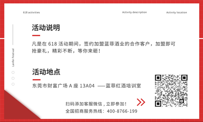 “618”購物狂歡節(jié)是與‘雙11’遙相呼應的一個全民網購狂歡節(jié),現已逐漸成為線上線下綜合的全民購物狂歡節(jié)。為迎接618狂歡慶典的到來,藍菲特舉辦“藍菲618,我要發(fā)”系列活動,惠饋我們新簽約合作的加盟商/代理商們,與我們共建紅酒事業(yè)。